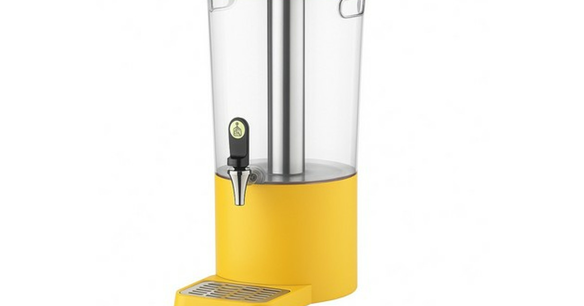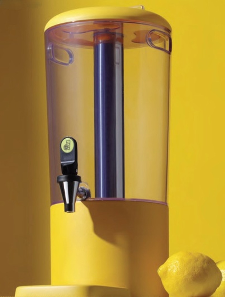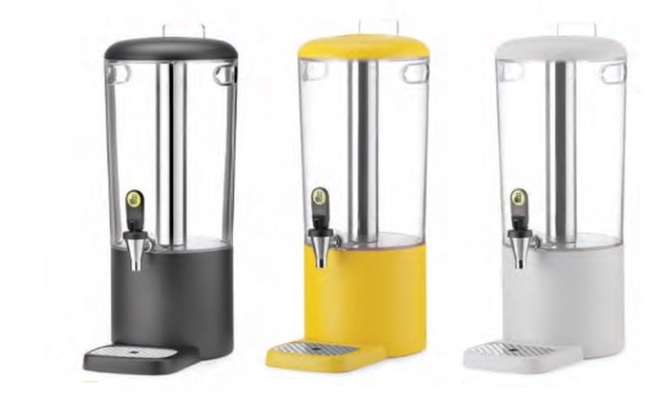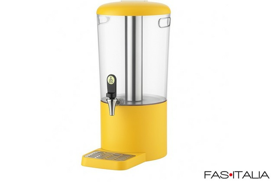 Distributore per bevande refrigerato per buffet e sala colazione. Composto da: contenitore in ABS trasparente, base colorata in polipropilene, tubo portaghiaccio in acciaio inossidabile, portaetichetta segnagusto sul coperchio, rubinetto antigoccia, vassoio raccogligoccia magnetico facile da pulire con inserto in acciaio inox forato. Design moderno e funzionale. Contenitore per bevande progettato per ridurre al minimo i residui sul fondo. Disponibile nei colori: nero, giallo, bianco. Capacità: 4 litri. Dimensioni: 21,1x31,5x43,1 cm (LxPxH).