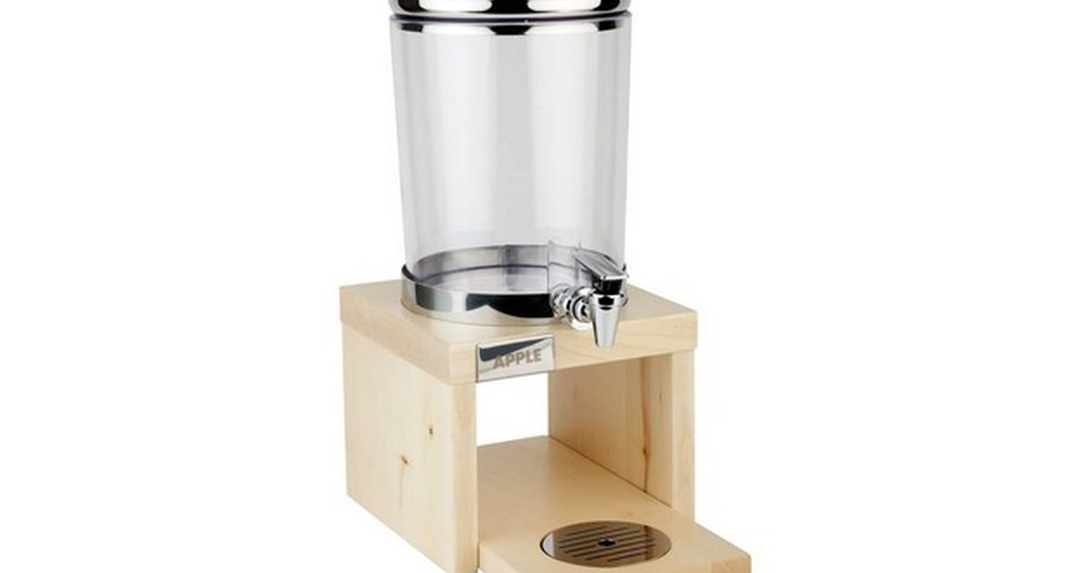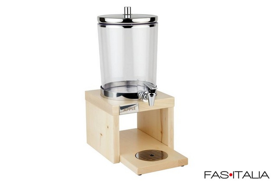 Distributore di succhi con rubinetto in metallo. Il prodotto è refrigerato mediante due piastrine eutettiche, alla base e nel coperchio. Dimensioni: 20x31x42 cm (LxPxH). Base in legno disponibile nei colori: Color legno chiaro, Color legno scuro.
