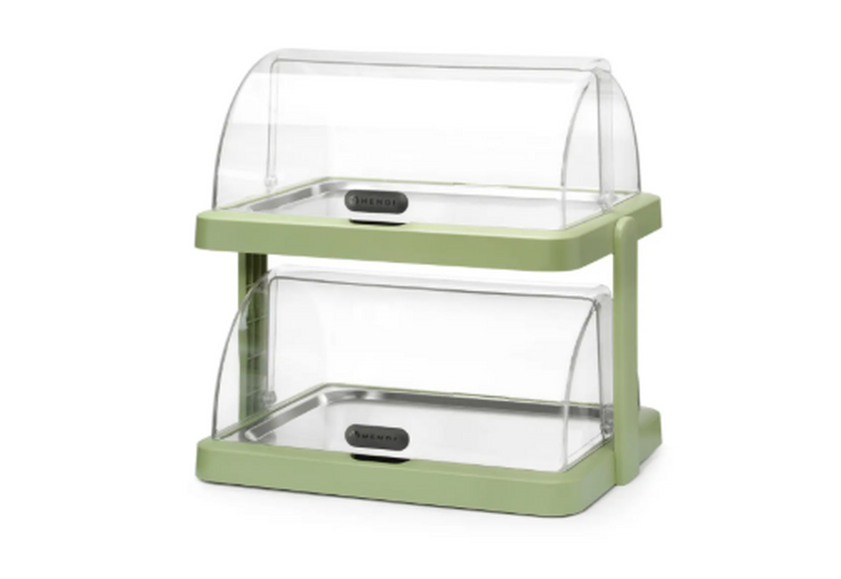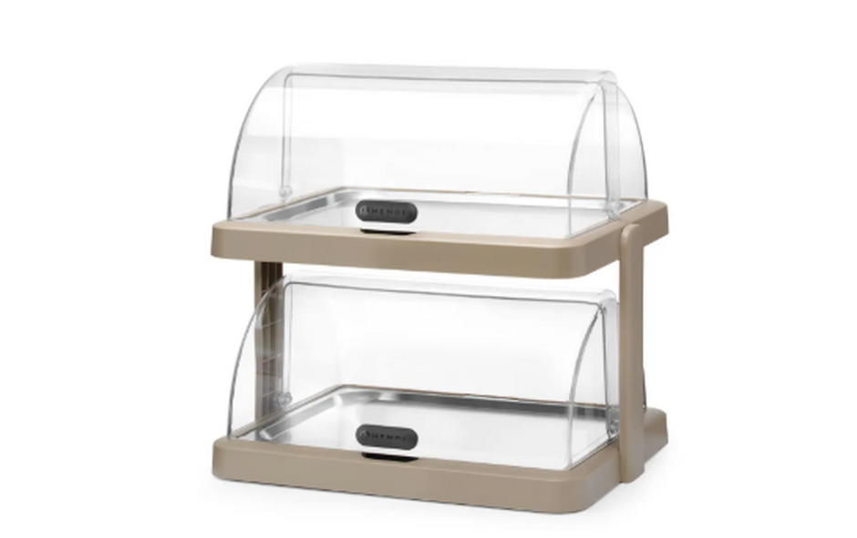 Composizione salvaspazio per buffet composto da 2 espositori refrigerati e struttura a due livelli in plastica colorata.Completo di: 2 cupole roll-top in ABS trasparente con maniglia, 2 vassoi per gli alimenti in acciaio inox, gel pack refrigeranti. Grazie al design moderno e funzionale, questo espositore si assembla e smonta rapidamente. Il vassoio inox è facilmente removibile per rifornire i prodotti durante il servizio. Disponibile nei colori: nero, verde, beige. Dimensioni della composizione: 48x35,5x48 cm (LxPxH). Dimensioni dei vassoi in acciaio: 40x30 cm.