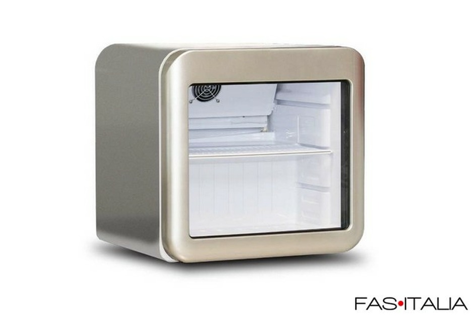 Vetrinetta cubica per bevande, colore grigio argento, capacità interna netta 41 litri.